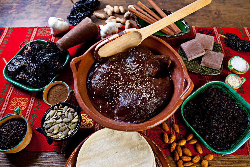 - Ingredients: Four kinds of chilies, raisins, nuts, sesame seeds, cacao, plantains, piloncillo (Mexican raw cane sugar), herbs & spices